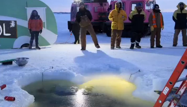 El equipo de expedición de la Antártida celebró el solsticio de invierno sumergiéndose en agua helada para nadar bajo cero a través de un agujero cortado en el hielo marino.