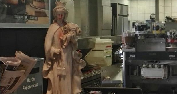 La intención de los empleados encargados de decorar el restaurante ha sido muy desafortunada al entender que por proceder de un cementerio, una figura deteriorada podía ser un detalle alegórico a los difuntos .Pero EN NINGUN CASO SE HA QUERIDO UTILIZAR LA IMAGEN RELIGIOSA DE LA VIRGEN Y DEL NIÑO por las que tenemos el más absoluto de los respetos y mi más particular devoción.