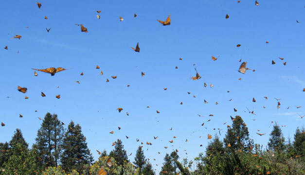 Las mariposas monarca migran hasta 4.000 kilómetros desde Canadá y Estados Unidos para llegar en noviembre a los bosques templados del Estado de México y Michoacán e hibernar durante cinco meses.