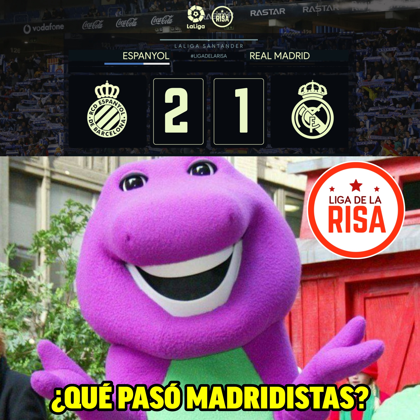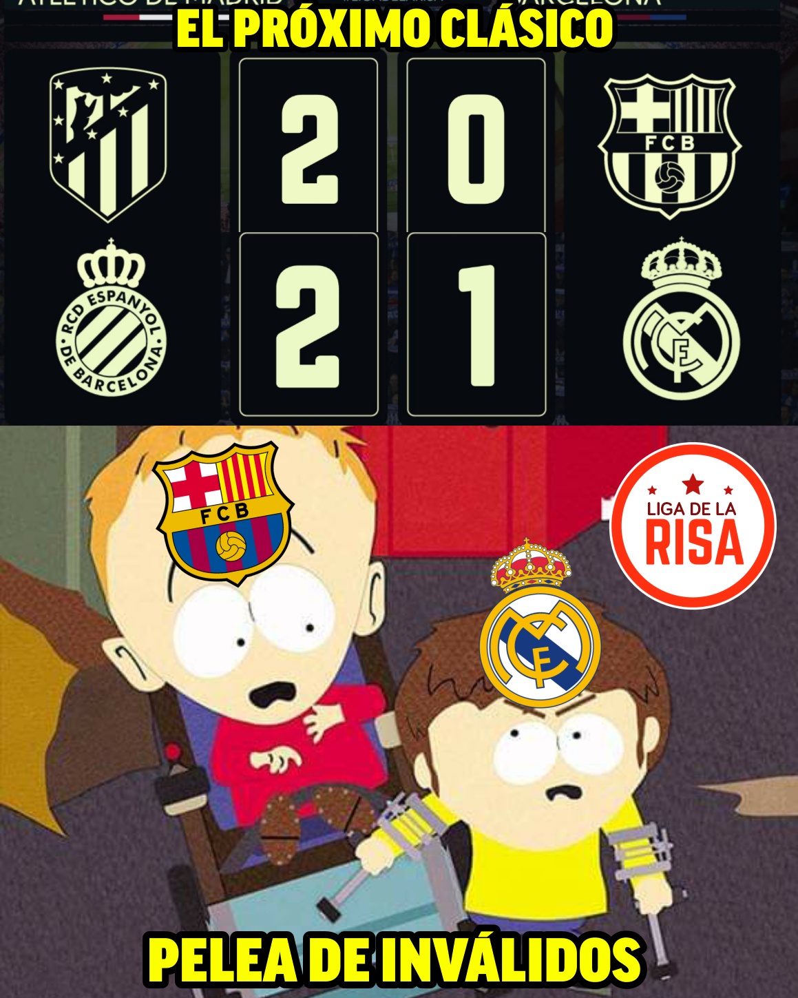 La fanpage de parodia deportiva, la Liga de la Risa, nos entrega esta vez una recopilación de memes sobre las derrotas del Barcelona ante el Atlético de Madrid (2-0) y del Real Madrid ante el Espanyol (2-1). Ni uno de los dos titanes de la liga española la vieron fácil esta jornada de Champions y en la liga española.
