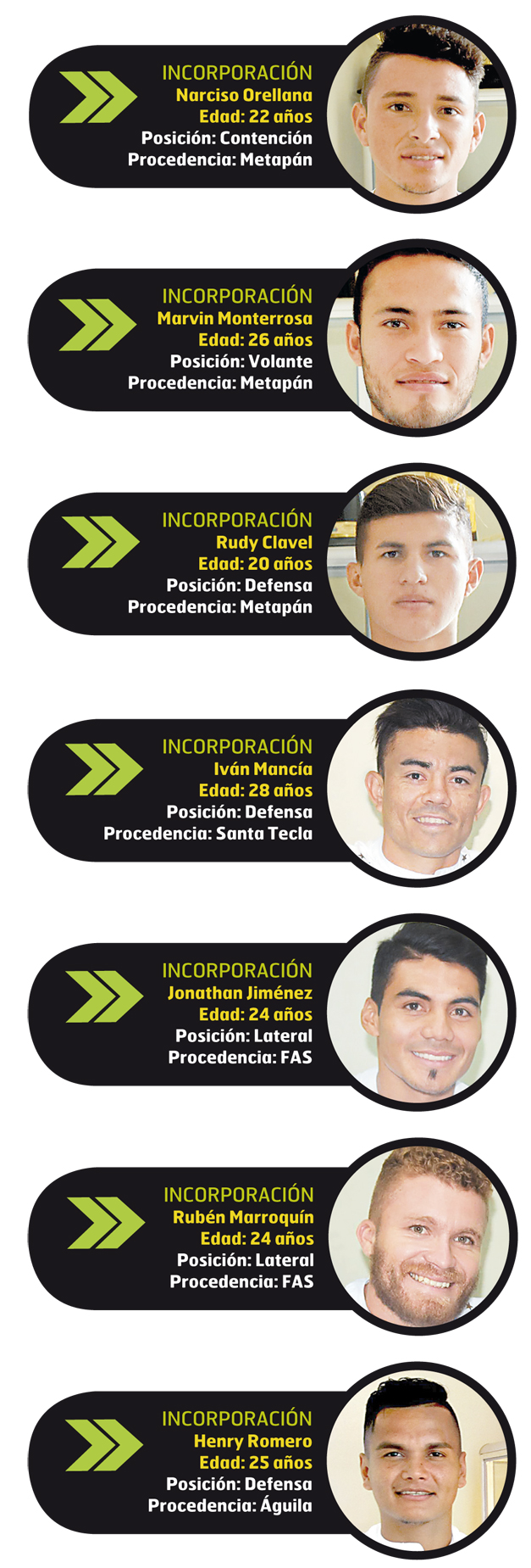 Del equipo metapaneco, llegan al equipo blanco para el Apertura 2017 el contención Narciso Orellana, el volante Marvin Monterroza y el defensa Rudy Clavel. Los dos primeros firmaron por cuatro torneos cortos y Rudy por tres años.