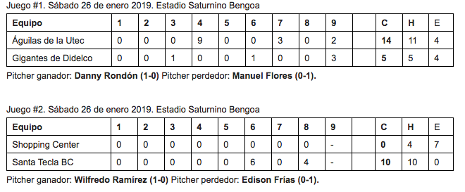 El equipo universitario derrotó 14 carreras por 5 a los puro hierro; mientras los periquitos verdes liquidaron 10 por 0 a la novena debutante. El naciente torneo continúa este martes 29 de enero con el duelo entre Didelco ante Shopping Center, a partir de las 7:10 pm en el diamante del Bengoa.