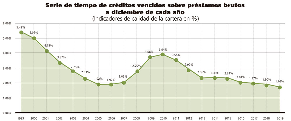 En los siguientes años comienza de decrecer y en 2019 se colocó en 1.76 %, esto equivale a 0.14 puntos menos si se compara con el 1.90 % de 2018. Frente al 5.42 % que representó en 1999, la mora de los créditos bancarios mostró una reducción de 3.66 % en los últimos 20 años.