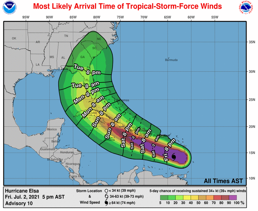 Las lluvias, marejadas ciclónicas y fuertes vientos de Elsa podrían afectar la península de Florida y sus cayos la semana entrante, aunque depende de cómo se comporte el huracán el fin de semana, cuando azote las grandes islas del Caribe, dijo el NHC.