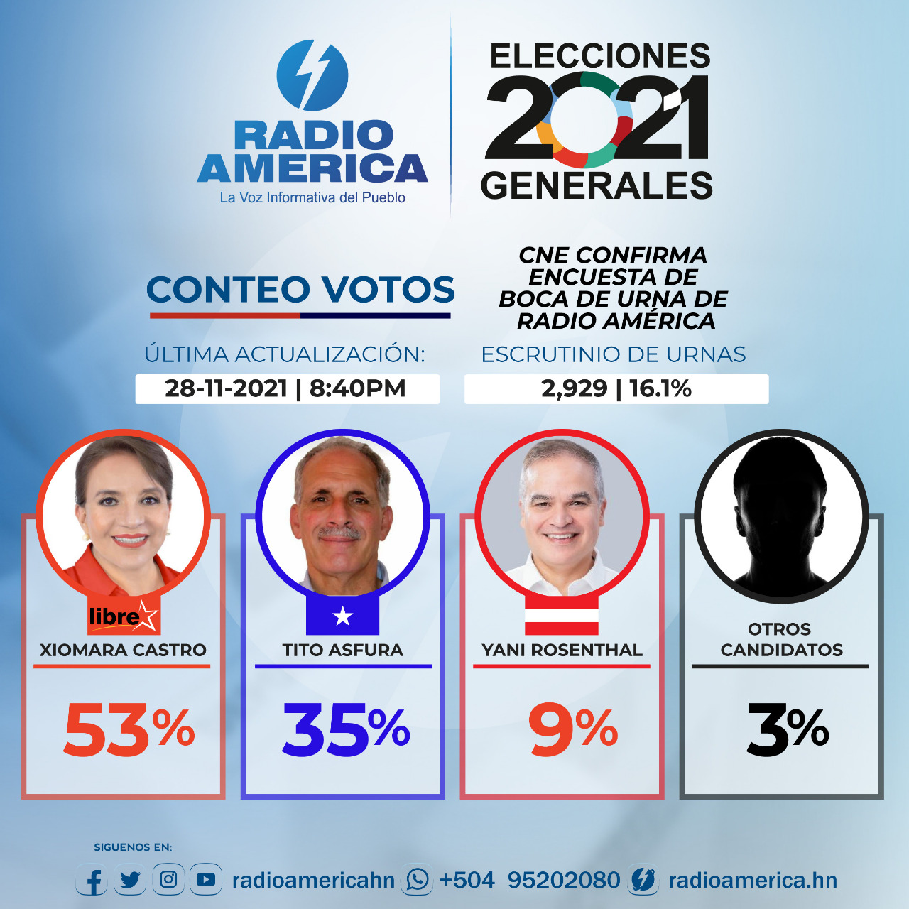 La candidata del Partido Libertad y Refundación (Libre), Xiomara Castro, supera por 19.43 puntos porcentuales al candidato del Partido Nacional de Honduras, Nasry Asfura, con el 16 % de votos escrutados.