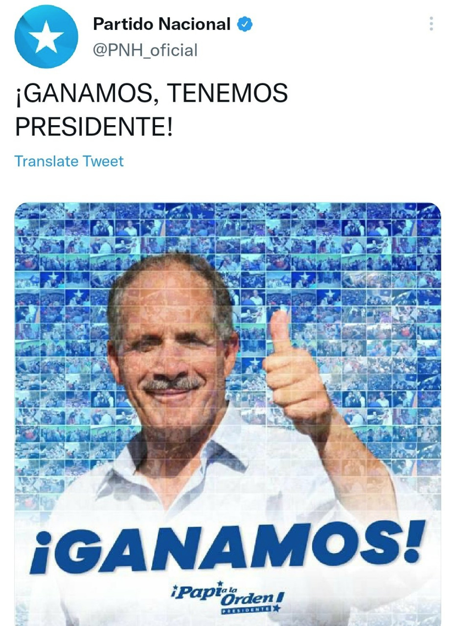 A través de Twitter, el Partido Nacional publicó una imagen con el mensaje "Ganamos" y la fotografía del candidato oficialista Asfura; mientras que el expresidente Manuel Zelaya, esposo de Xiomara Castro, la proclamó como la triunfadora de la contienda Electoral en la misma red.