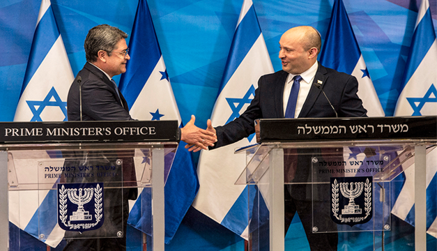 El presidente hondureño, Juan Orlando Hernández, y su canciller, Lisandro Rosales, fueron recibidos por el primer ministro israelí, Naftali Bennett, y su jefe de la diplomacia, Yair Lapid, en una recepción en un edificio de oficinas en un parque tecnológico al sur de Jerusalén.