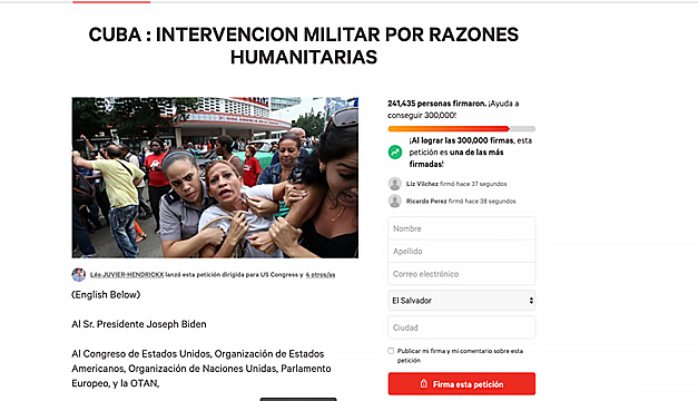 Una petición dirigida al presidente estadounidense, Joe Biden, para una intervención militar en Cuba publicada en la plataforma Change.org por un cubano exiliado en Bélgica ha recopilado ya más de 240.000 firmas.