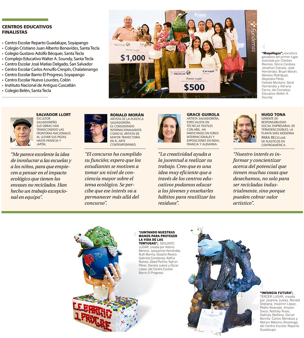 Cabe mencionar que el concurso contó con un ilustre jurado de personalidades salvadoreñas: los artistas plásticos Salvador Llort, Ronald Morán y Grace Guirola, así como Hugo Tona, gerente de RSE en la empresa Termoencogibles. Ellos evaluaron criterios de creatividad, originalidad y estética, así como dimensiones y el uso un 80% de materiales reciclados en cada estructura.