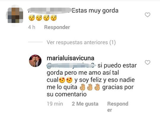 El comentario pareció no gustar nada a María Luisa, quien de manera cortés respondió a dicha critica: "Sí, puedo estar gorda, pero me amo así tal cual?? y soy feliz y eso nadie me lo quita ??? gracias por su comentario", escribió la ex Miss.