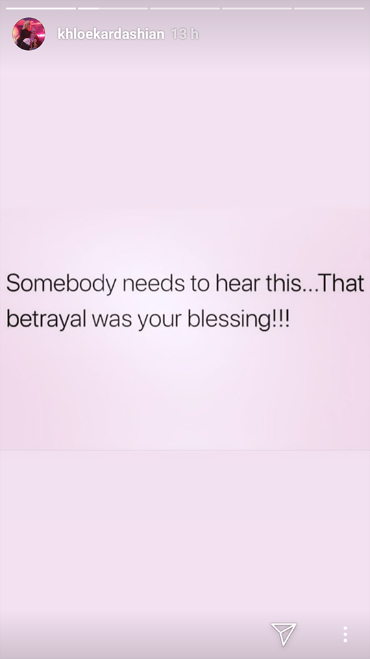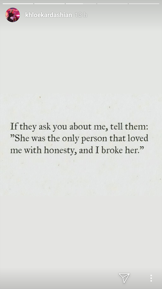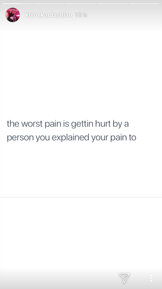 A través de sus historias de Instagram, Khloé reflejó sentimientos de dolor, tristeza y decepción por la traición de su pareja y de alguien tan cercano a la familia Kardashian.
