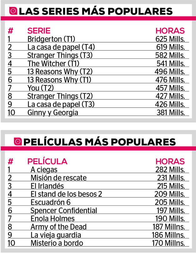 Completan los primeros puestos la temporada inicial de The Witcher con 541 millones de horas en sus primeros 28 días; la segunda y la primera temporada de Por trece razones, con 496 millones y 476 millones de horas vistas, respectivamente; la segunda entrega de You con 457 millones, la temporada 2 de Stranger Things con 427 millones; la tercera entrega de La casa de papel con 426 millones de horas; y Ginny y Georgia que con su primera temporada sumó 381 millones de horas vistas.