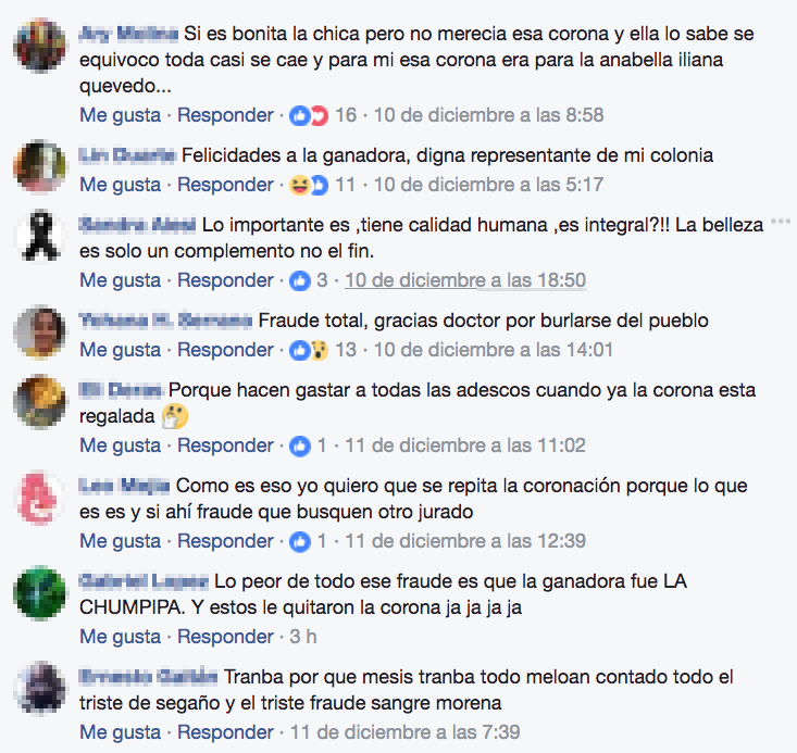 Padres de familia y representantes de las Asociaciones de Desarrollo Comunal (Adescos) hicieron uso de las redes sociales para expresar sus dudas sobre el proceso de elección y la señalaron de "fraude", además de protestar porque a las candidatas se les habría preguntado durante la ceremonia pública sobre sobre las actividades políticas del alcalde Dr. Francisco Salvador Hirezi.