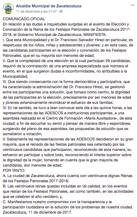“La ciudad de Zacatecoluca ahora cuenta con 29 dignas reinas de los Festejos Patronales 2017-2018. Las 29 reinas quedan incluidas en tal calidad, en los eventos que restan... así también en las actividades que se celebren el año venidero", prosigue la publicación en la que se comprometen a cumpliar en otras elecciones "con la transparencia y la participación ciudadana en la solución de los problemas de nuestra ciudad”.