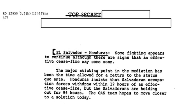 Este segundo boletín informa al presidente estadounidense sobre “aviones salvadoreños bombardeando y sobrevolando posiciones hondureñas en la frontera, así como el aeropuerto en Tegucigalpa…”. La estrategia salvadoreña según los analistas de la CIA, era la de “continuar sus ataques anticipándose a un prematuro cese al fuego acordado por la OEA…”. De igual forma, destacaban “la tremenda euforia ente la oficialidad en San Salvador”, agregando que: “Ellos aparentemente creen que la agresividad mostrada por su país dejará satisfacer las exigencias internas de una acción militar para vengar los reveses sufridos en la frontera con Honduras durante anteriores altercados y por el maltrato sufrido por los salvadoreños que vivían en Honduras…”. El informe concluye afirmando que: “El Salvador podría aceptar un cese al fuego con la esperanza de evitar un contra ataque hondureño”.