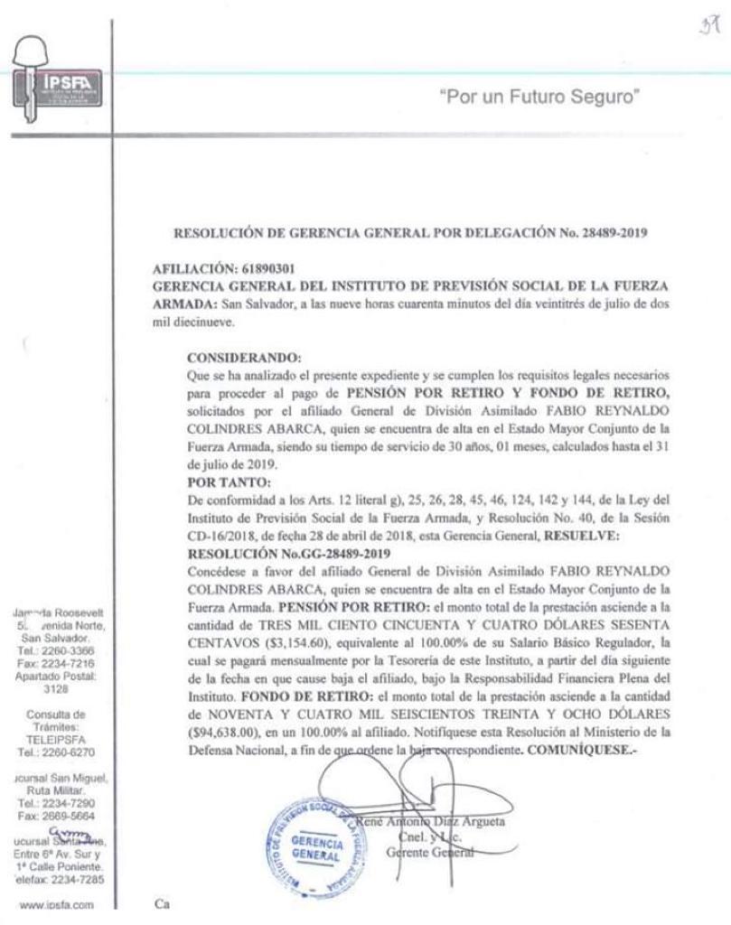 El Instituto también señala que Colindres tiene un fondo de pensión de $94,638 y que mensualmente gozará el 100% de su sueldo.
