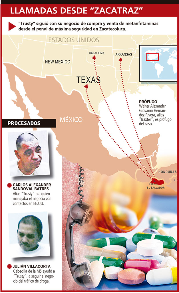 La reclusión no fue ninguna barrera para seguir inmerso en el tráfico ilícito de metanfetamina, pues desde la cárcel siguió dirigiendo el negocio con la ayuda de otros dos cabecillas, identificados como Julián Villacorta y Walter Alexander Giovanni Hernández Rivera, alias, “Baxter”, este último es prófugo.