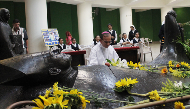 Monseñor Rosa Chávez asistió ayer a la tumba del Beato Romero, celebró misas y recibió el saludo afectuoso de feligreses./ DEM