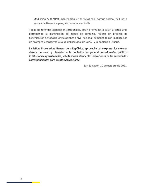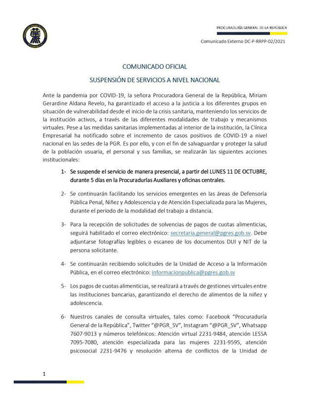 La Procuraduría informó que la recepción de solicitudes de solvencias de pagos de cuotas alimenticias se hará por medio del correo secretaria.general@pgres.gob.sv anexando "fotografías legibles o escaneo de los documentos DUI y NIT" del solicitante.