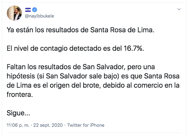 “Ya están los resultados de Santa Rosa de Lima. El nivel de contagio detectado es del 16.7%. Faltan los resultados de San Salvador, pero una hipótesis (si San Salvador sale bajo) es que Santa Rosa de Lima es el origen del brote, debido al comercio en la frontera”. Nayib Bukele, presidente de El Salvador