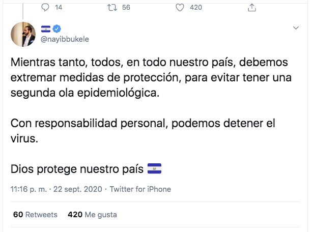 Bukele insistió en sus mensajes en la red social que los salvadoreños deben extremar las medidas de distanciamiento y lavado de manos, para evitar según él una posible “segunda ola epidemiológica” del covid-19.