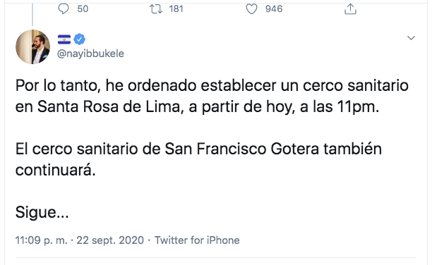 “Por lo tanto, he ordenado establecer un cerco sanitario en Santa Rosa de Lima, a partir de hoy, a las 11:00 PM. El cerco sanitario de San Francisco Gotera también continuará”. Nayib Bukele, presidente de El Salvador.