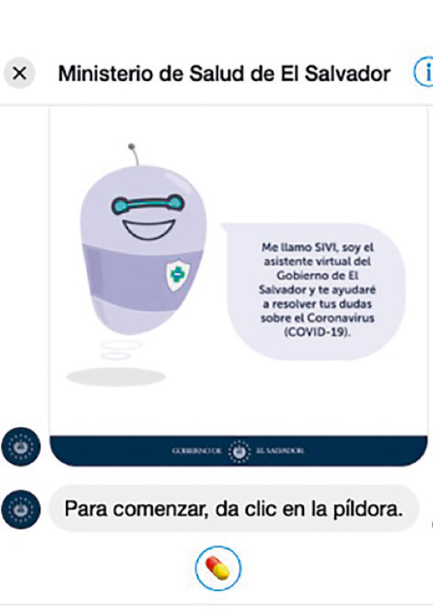 “Me llamo SIVI, soy el asistente virtual del Gobierno de El Salvador y te ayudaré a resolver tus dudas sobre el coronavirus (COVID-19)”, es la presentación del “bot” en la plataforma.