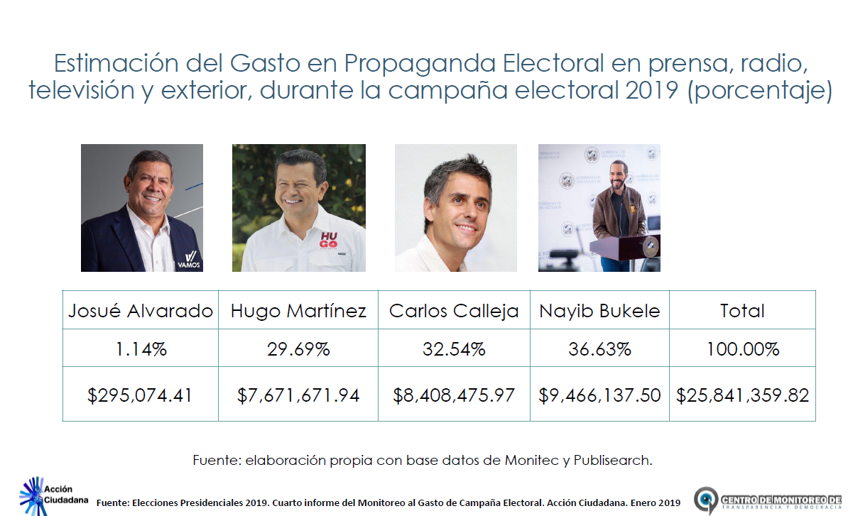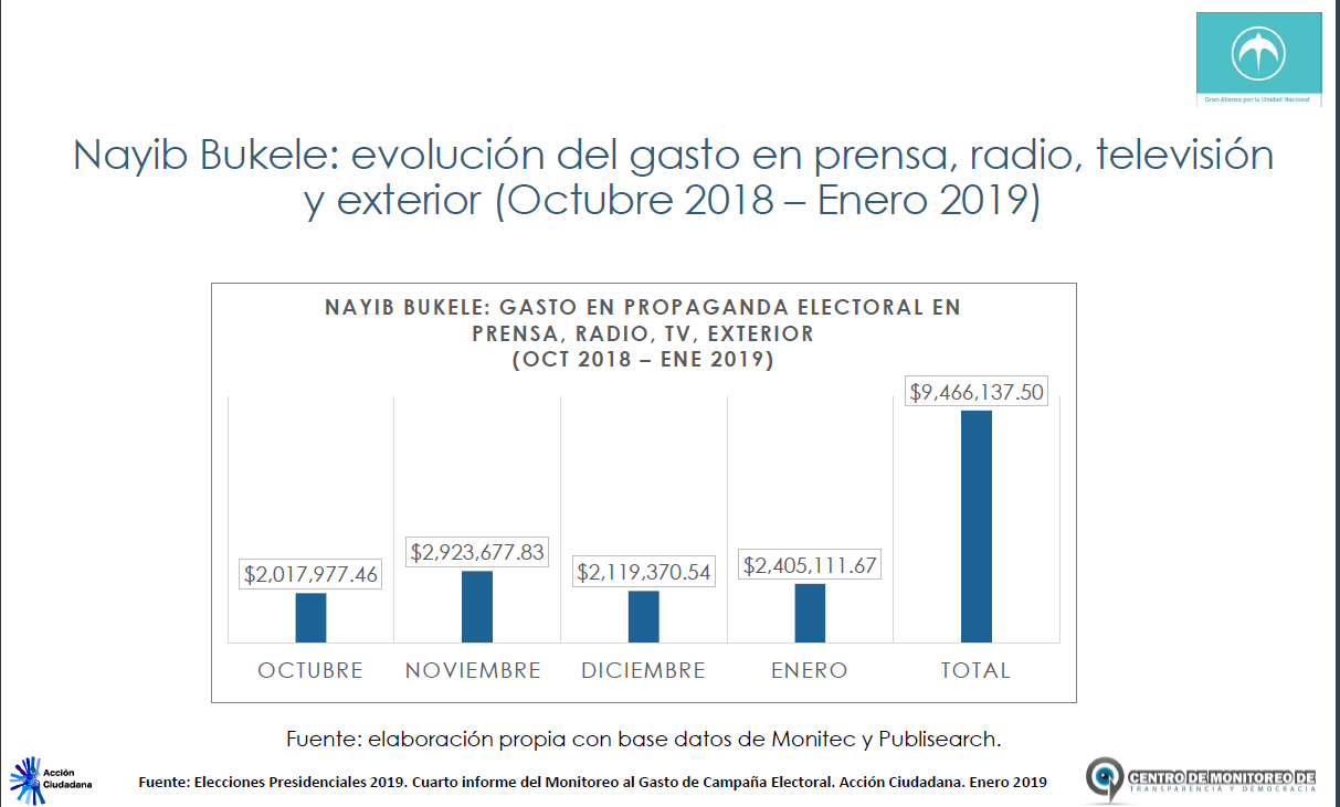 El candidato presidencial de GANA, Nayib Bukele, fue quien tuvo el mayor gasto en publicidad, durante los cuatro meses de campaña electoral, según el informe de estimaciones de gasto presentado esta mañana por el Centro de Monitoreo de Acción Ciudadana.