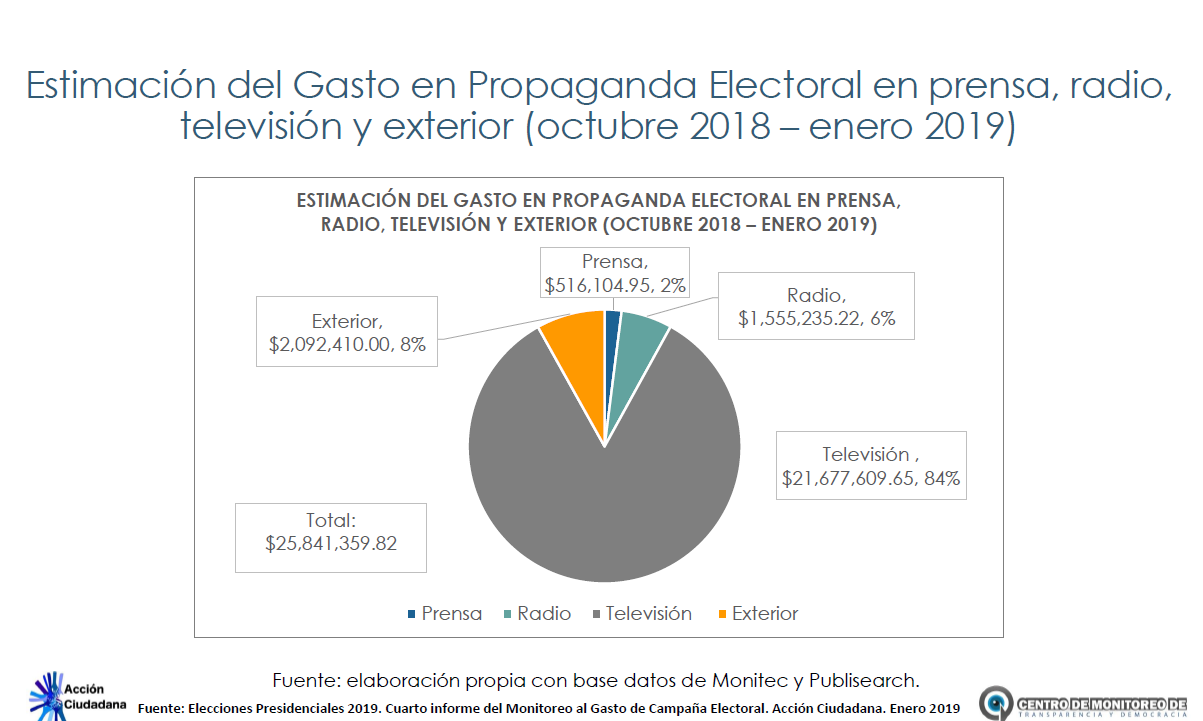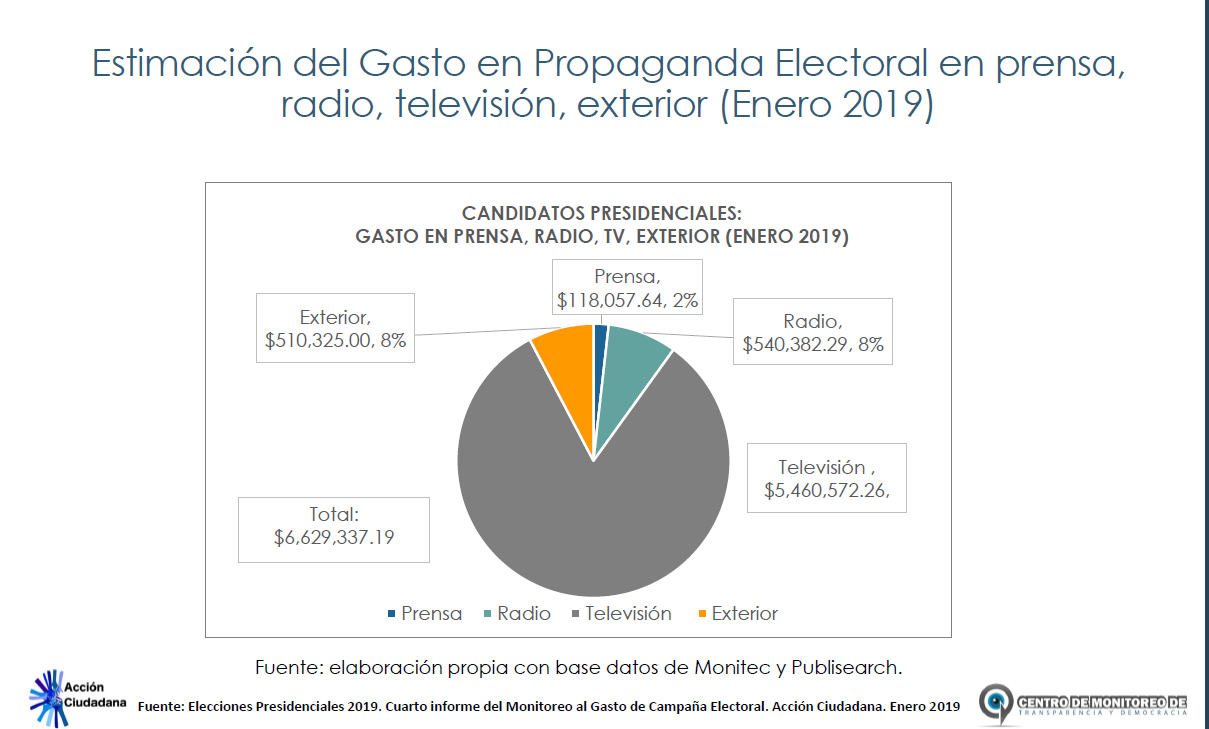 El gasto en propaganda electoral de los cuatro candidatos sólo en enero, en los cuatro medios de comunicación, fue de $6.6 millones. Mientras que en total, durante los cuatro meses, el gasto fue arriba de $25 millones, de los cuales un 84 % corresponde a televisión.