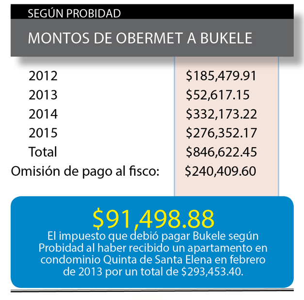 La Sección de Probidad de la Corte Suprema de Justicia (CSJ) ha reportado a los 15 magistrados del pleno que Nayib Bukele declaró haber recibido un total $846,622.45 entre los años 2012 y 2015 de la sociedad Obermet S.A. de C.V. De acuerdo a Probidad, según fuentes del Órgano Judicial, Obermet emitía cheques mensuales a favor de terceras personas que entregaban en efectivo los fondos a Bukele y se registraban en la contabilidad de dicha empresa como préstamos de su hermano.