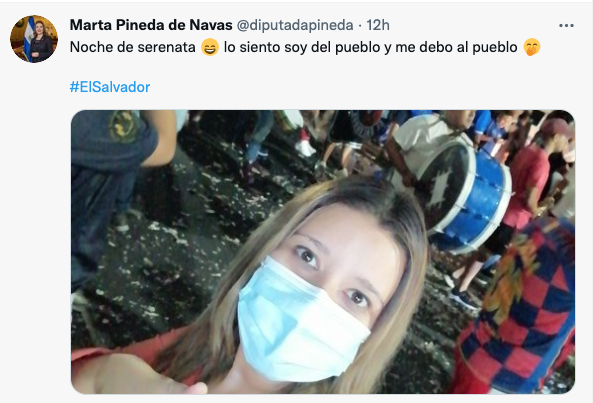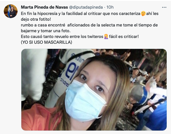 La diputada Marta Pineda de Navas recibió críticas en redes sociales luego de que publicara una selfi en Twitter en medio de una serenata de aficionados de la Selección salvadoreña de fútbol que juega hoy contra México.