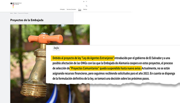 Actualmente, no se están asignando recursos financieros, pero seguimos recibiendo solicitudes para el año 2022. En cuanto se disponga de la formulación definitiva de la ley, se tomará una decisión sobre los próximos pasos”. Sitio de la Embajada de Alemania.El dictamen favorable de la Ley de Agentes Extranjeros fue aprobado este martes por 9 diputados de la Comisión de Relaciones Exteriores de la Asamblea Legislativa. Sin embargo, los legisladores no incluyeron el dictamen en la agenda de la sesión plenaria de este miércoles y, hasta esta noche, no han aprobado la ley sin que la sesión haya concluido.
