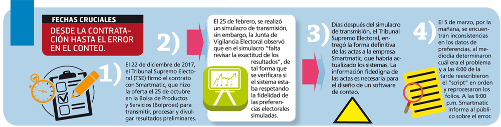 El representante de la empresa encargada de los resultados preliminares, Smartmatic, Francisco Campos, aseguró ayer que están dispuestos a una investigación y anunció que la empresa realiza auditorías. El error fue conocido públicamente la noche del 5 de marzo en una conferencia programada a las 9:00 de la noche, en la cual Campos explicaba que se debía a un “script”, una especie de lenguaje de programación con órdenes, y lo atribuía a “un error humano”.
