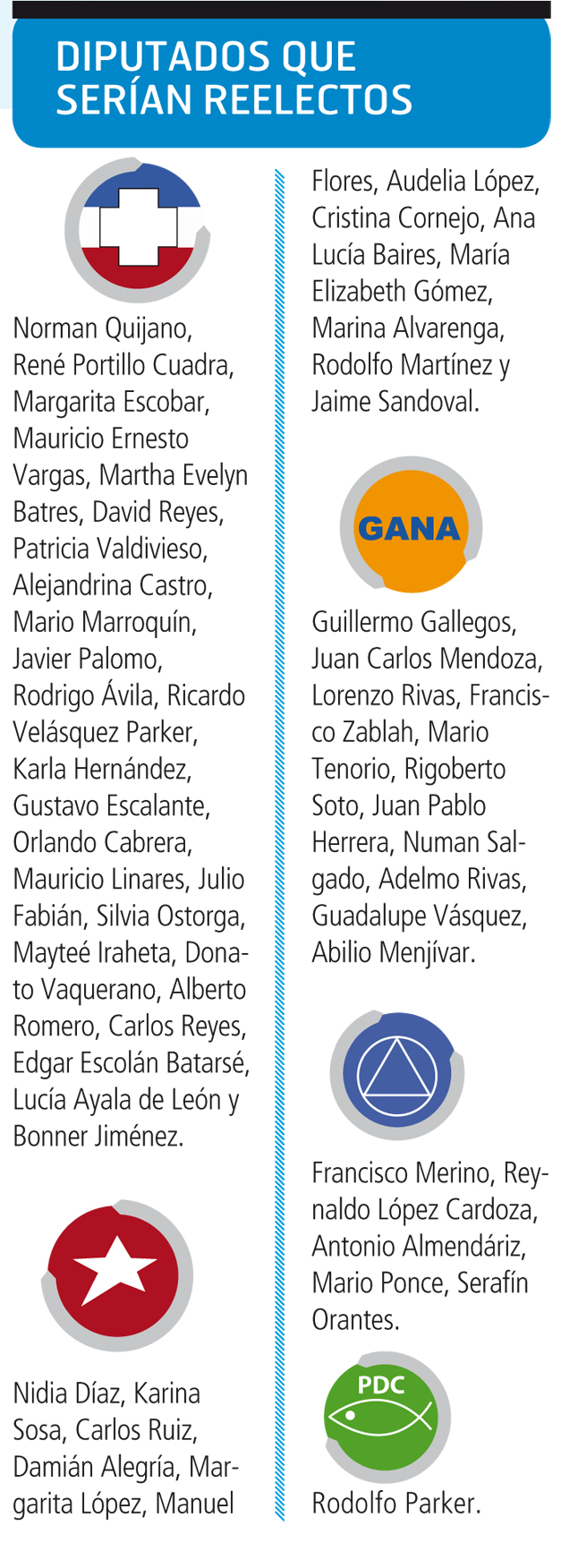 La nueva legislatura también estaría integrada por todos los diputados actuales del partido GANA, es decir, ninguno de los legisladores es nuevo.