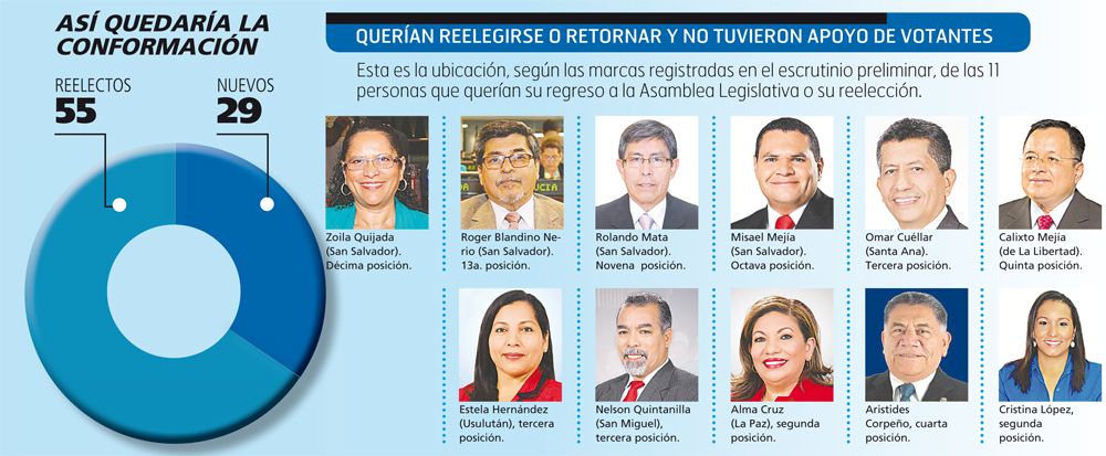 Un total de 55 personas que actualmente fungen como diputados propietarios o suplentes que aspiraron a la reelección o a retornar a la Asamblea Legislativa lograron ganar una curul.
