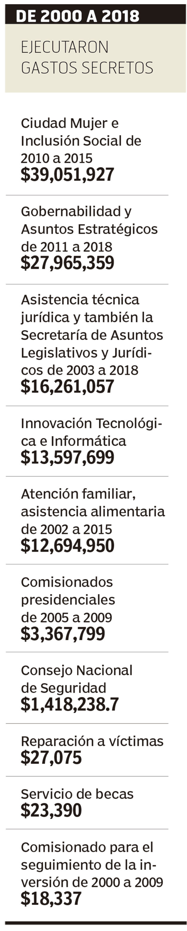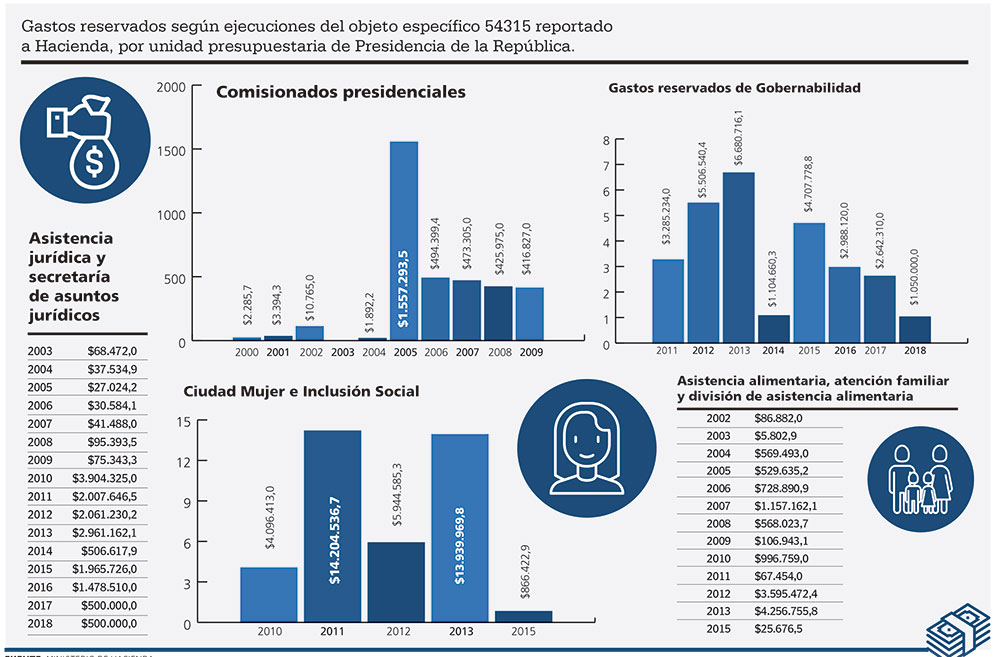Un recuento de 19 años deja ver que la unidad presidencial que mayor cantidad de fondos bajo reserva recibió fue Servicio de Comunicación Oficial de la Presidencia, un total de $178,237,792.6. El gasto secreto de esta unidad osciló entre $5 millones en 2000, $14.6 millones en 2005 y $900,000 en 2018.
