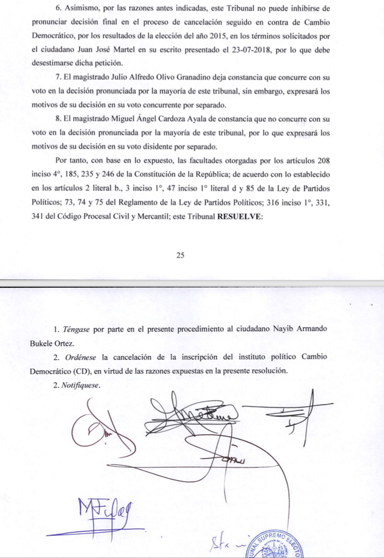 En la resolución, el TSE señala que, si bien es cierto la Sala de lo Constitucional permitió la participación del CD debido a su demora en resolver, dichos resultados electorales no subsanan que el CD no alcanzara el número de votos necesarios para subsistir.