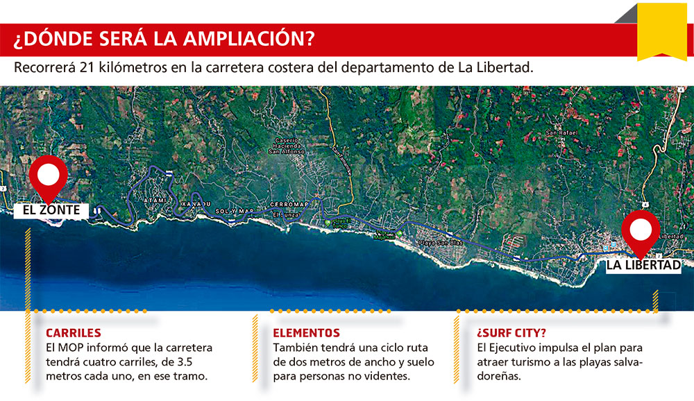 El tramo a intervenir, que comprende 21 kilómetros en total, se ubica sobre la carretera del Litoral, específicamente en 100 metros antes de llegar a la intersección entre la carretera al Puerto de La Libertad, que conduce desde San Salvador, y la zona conocida como playa El Obispo.