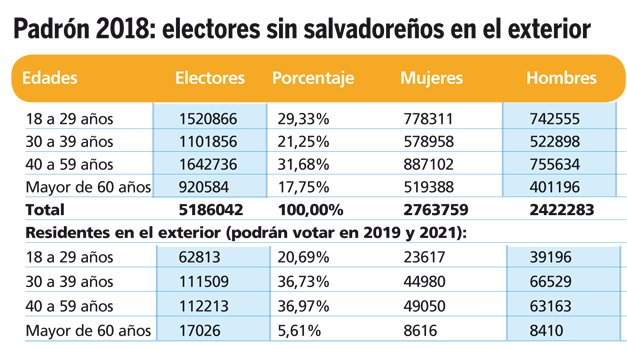 Si bien la tercera parte de los electores salvadoreños para 2018 no superan los 30 años, una cantidad mayor tiene edades que oscilan entre 30 y 59 años: un 52.9 %, de los cuales el 31.7 % oscila entre los 40 y 59 años.