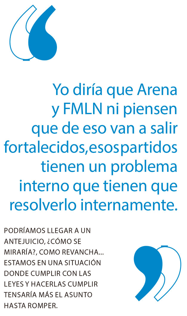 Pero quiero decirle que ese es un escenario que está contemplado en el diseño institucional de la Constitución, nosotros tenemos una forma de gobierno, se llama presidencialismo, en la que elegimos de manera separada al Presidente y a la Asamblea, los dos cuentan con esa legitimidad, pero además tenemos un sistema multipartidista que hace que en la combinación presidencialismo-multipartidismo el resultado más frecuente sea que el Presidente no tenga mayoría legislativa, si a eso agregamos la separación de elecciones cada tres años de diputados y cada cinco Presidente, eso abona a que el Presidente no tenga mayoría y si, además, no tiene un partido. No tendría que haber sido el presidente Bukele el que estaría en esta situación, de hecho todos los presidentes anteriores han estado en esa situación, lo que pasa negociaron, lo que uno puede discutir es qué negociaron, Arena con PCN, y FMLN con Gana. El problema de este es que con su afán de poder total tiene que acabarse a todos esos partidos que son los que tienen la mayoría legislativa.