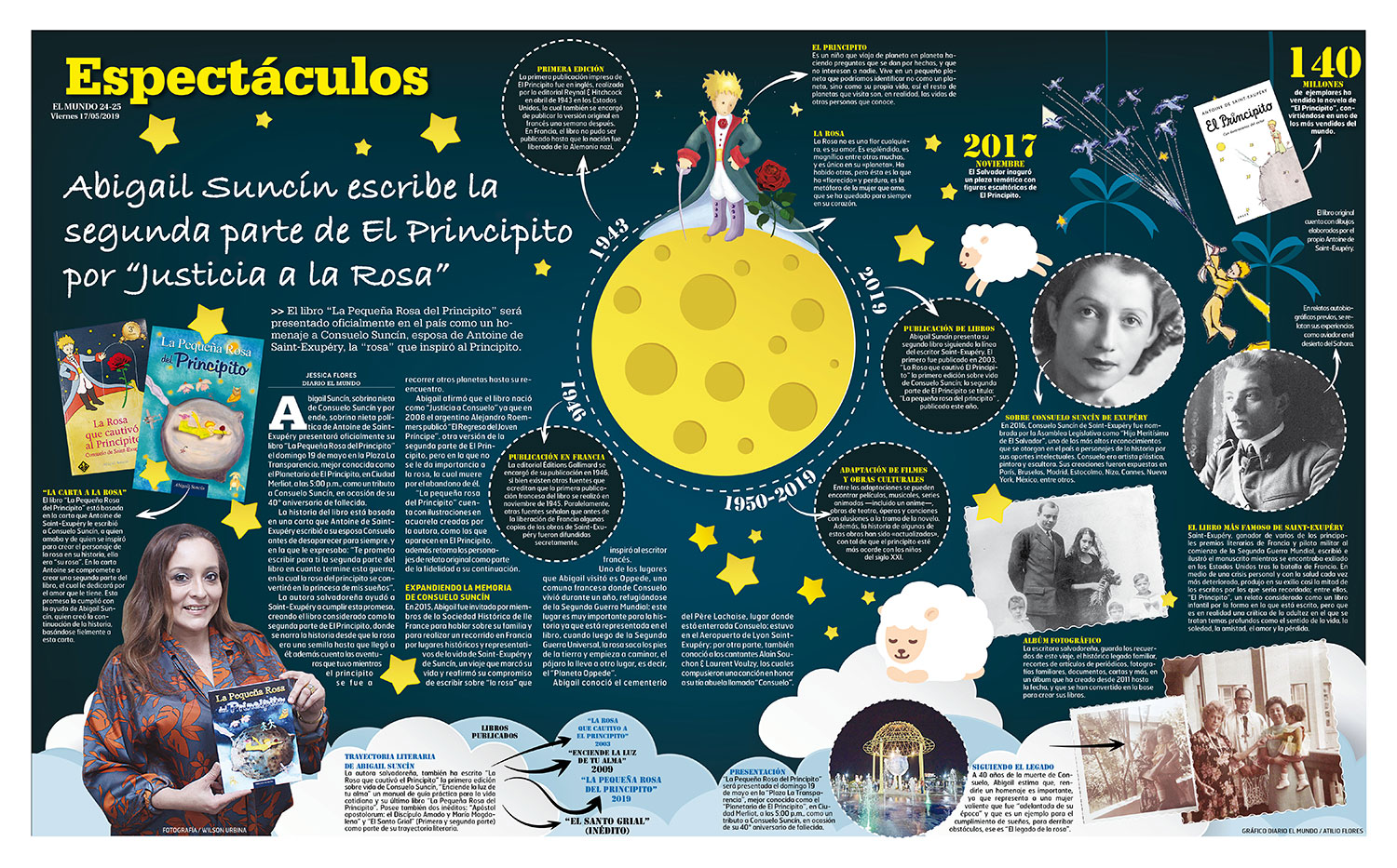 Abigail Suncín, sobrina nieta de Consuelo Suncín y por ende, sobrina nieta política de Antoine de Saint-Exupéry presentará oficialmente su libro “La Pequeña Rosa del Principito” el domingo 19 de mayo en la Plaza La Transparencia, mejor conocida como el Planetario de El Principito, en Ciudad Merliot, a las 5:00 p.m., como un tributo a Consuelo Suncín, en ocasión de su 40° aniversario de fallecida.