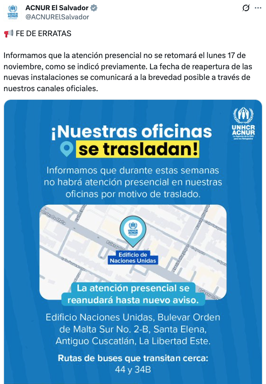 La Agencia de la Organización de las Naciones Unidas para los Refugiados (Acnur) en El Salvador emitió un nuevo aviso en sus redes sociales para informar que el cierre temporal de sus oficinas se extenderá hasta nuevo aviso por el traslado a sus nuevas instalaciones en Santa Elena.