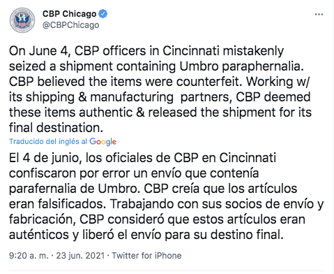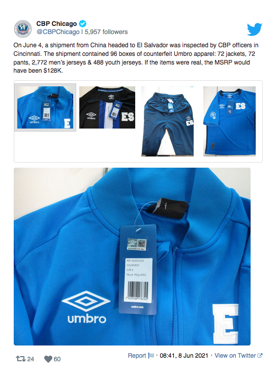 El 4 de junio, los oficiales de CBP en Cincinnati confiscaron por error un envío que contenía parafernalia de Umbro. CBP creía que los artículos eran falsificados. Trabajando con sus socios de envío y fabricación, CBP consideró que estos artículos eran auténticos y liberó el envío para su destino final”. informó la Oficina de Aduanas de EEUU.