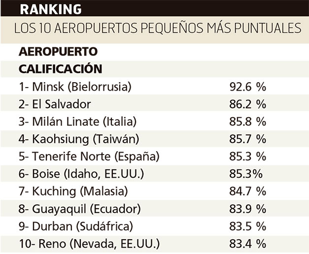 El ranking de las plataformas aeroportuarias pequeñas con mejor puntualidad es liderado por el Aeropuerto Internacional de Minsk, de Bielorrusia, un país de Europa Oriental. Tuvo una calificación de 92.60 % en el desempeño de puntualidad, según indicó el OAG.