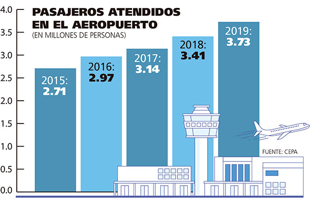 Los aeropuerto pequeños, según el OAG, son aquellos que tienen un movimiento entre 2.5 y cinco millones de asientos de salida. Está en línea con los datos oficiales de la Comisión Ejecutiva Portuaria Autónoma (CEPA), los cuales revelan que el flujo de pasajeros a lo largo de 2019 sumaron 3.73 millones.