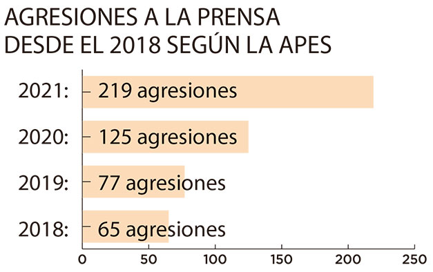 Del 1 de enero al 29 de diciembre de 2021, la APES ha recibido denuncias de 219 agresiones contra de la prensa, un alza de 239 % al compararlo con 2018, previo a la gestión de Nayib Bukele.