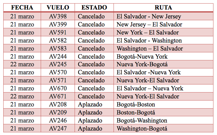 Avianca indicó que "ajusta su operación en los vuelos con destino a Boston, Nueva York, New Jersey y Washington programados para este miércoles 21 de marzo. Nueve de esos vuelos tenían como destino o salida a El Salvador.