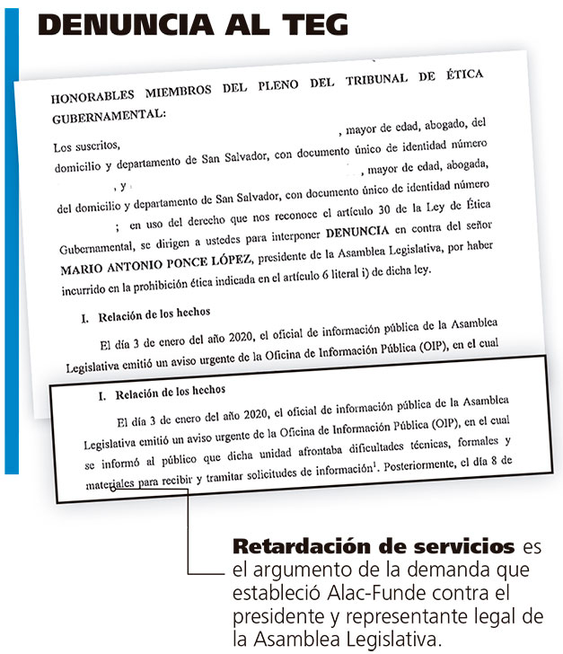 Estas dificultades hicieron que el Centro de Asesoría Legal Anticorrupción (Alac) de la Fundación Nacional para el Desarrollo (Funde) interpusiera una demanda contra el diputado Mario Ponce, actual presidente de la Asamblea Legislativa y quien actúa como representante de la institución legislativa.