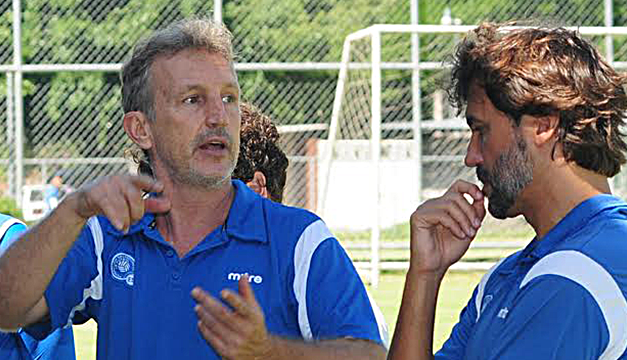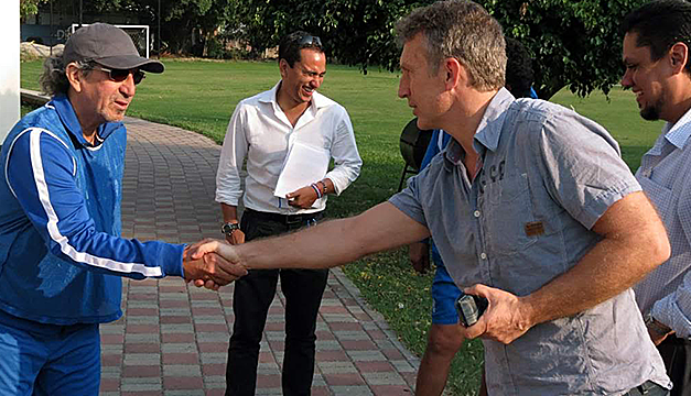 Albert Roca saluda al Mágico González durante sus días en El Salvador.