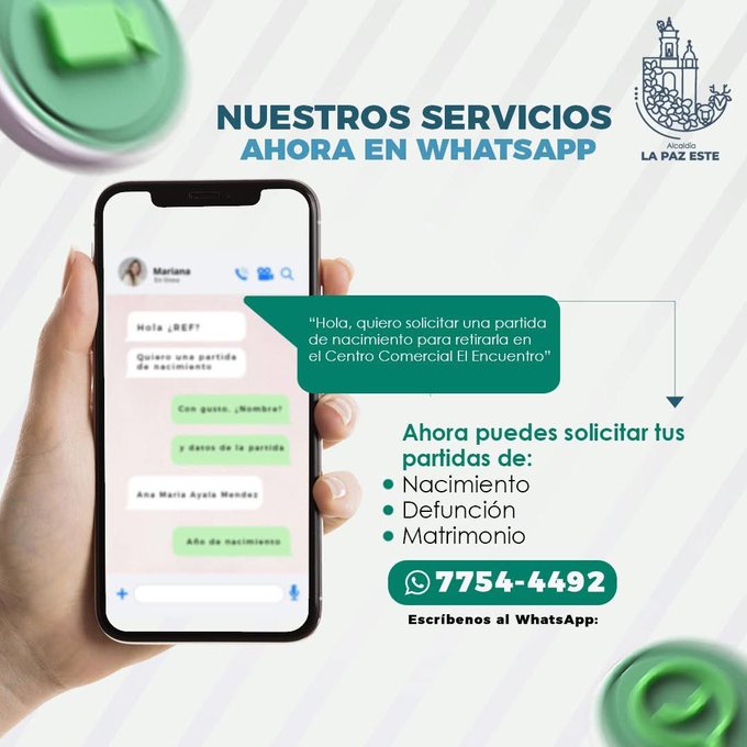 Las partidas de nacimiento, defunción y matrimonio pueden ser solicitadas a través del WhatsApp en La Paz Este según informó esta semana la alcaldesa de ese municipio, Marcela Pineda. La unidad del Registro del Estado Familiar ha creado su propia cuenta para atender estos trámites.